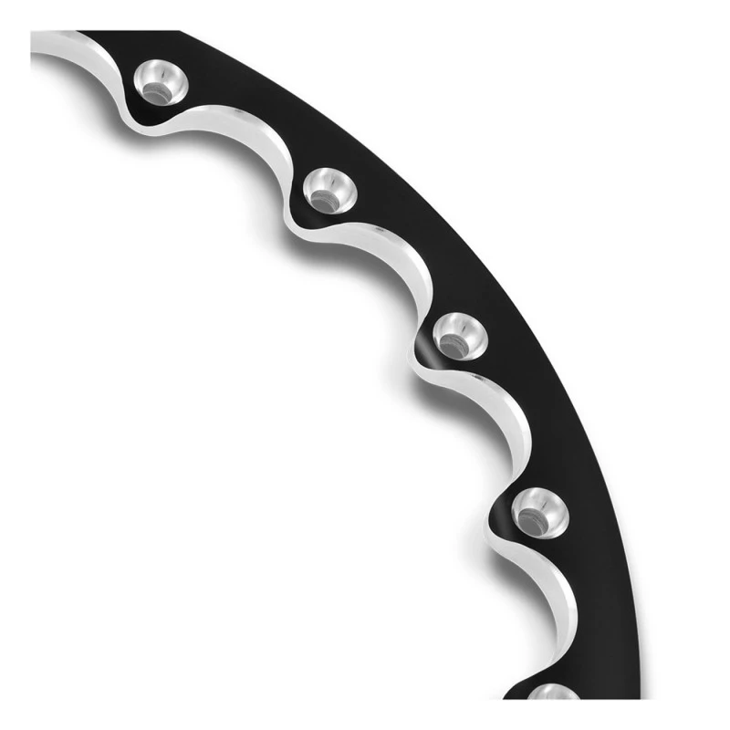உற்பத்தியின் மேற்பரப்பு அனோடைஸ் வண்ணமயமாக்கல் சிகிச்சையை ஆதரிக்கிறது (விருப்ப சிவப்பு/நீலம்/தங்கம்/கருப்பு மற்றும் பிற போட்டி வண்ணங்கள்), இது காட்சி தாக்கத்தை மேம்படுத்துவதோடு மட்டுமல்லாமல், அரிப்பை எதிர்க்கும் பாதுகாப்பு அடுக்கையும் உருவாக்குகிறது மற்றும் சேவை வாழ்க்கையை விரிவுபடுத்துகிறது. அதன் புதுமையான பூட்டுதல் அமைப்பு டயர் உதட்டை உறுதியாக சரிசெய்யலாம், டயர் லிப் இடப்பெயர்ச்சி அல்லது உயர் மையவிலக்கு சக்தி நிலைமைகளின் கீழ் பிரிப்பதை திறம்பட தடுக்கலாம், மேலும் வளைவின் நிலைத்தன்மையையும் பாதுகாப்பையும் கணிசமாக மேம்படுத்தலாம்.